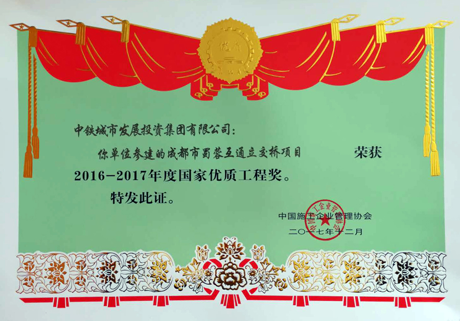 中鐵城投集團工程總承包管理、中鐵一局四公司施工的成都天府新區(qū)蜀蓉立交橋工程項目榮獲2016至2017年度國家優(yōu)質(zhì)工程獎。
